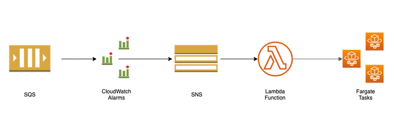 - SNS messages trigger a lambda, which checks the name of the alarm and calls the Fargate RunTask API to start an appropriate number of tasks to handle the incoming SQS messages. For example: